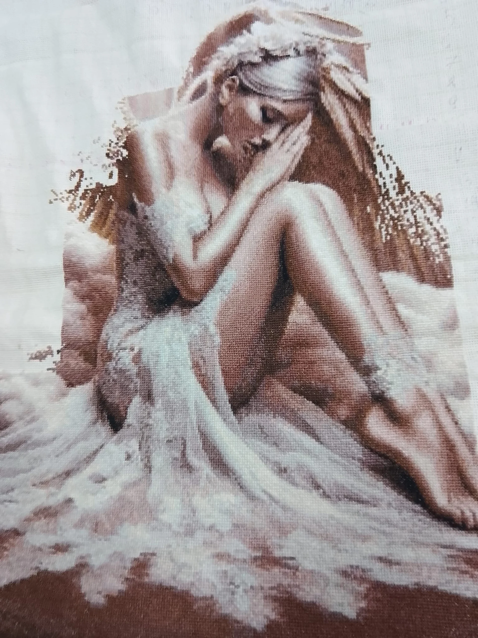 Комплектът на фирма Fantastic-R съдържа панама с игла, черно-бяла схема размер А4 и комплект конци готови за бродиране.