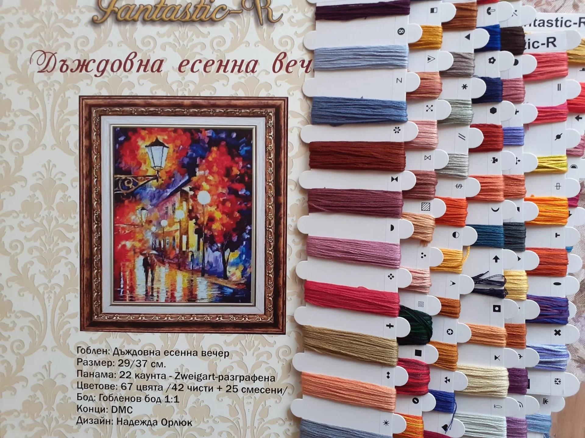 Комплектът на фирма Fantastic-R съдържа панама с игла, черно-бяла схема размер А4 и комплект конци готови за бродиране.
