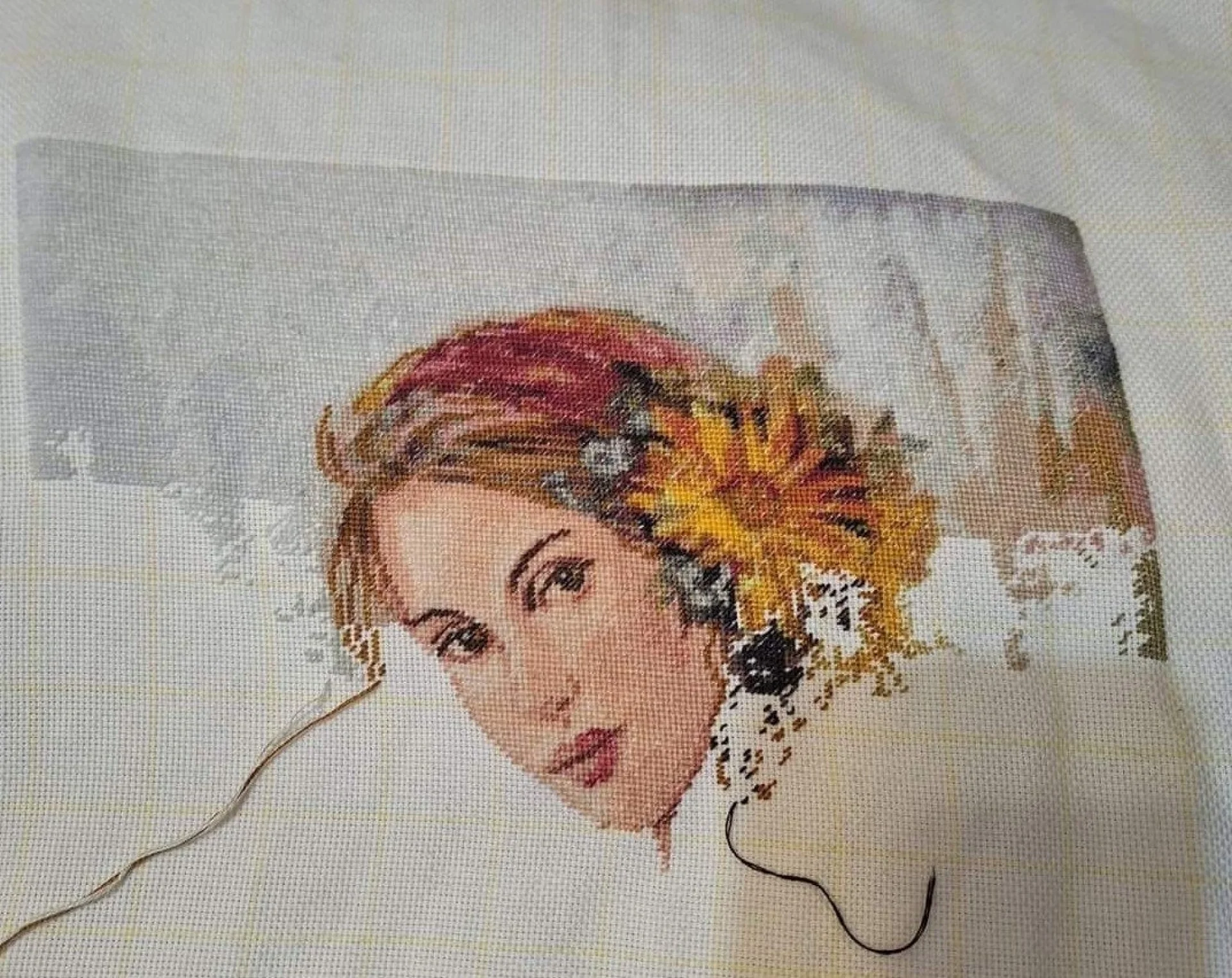 Комплектът на фирма Fantastic-R съдържа панама с игла, черно-бяла схема размер А4 и комплект конци готови за бродиране.