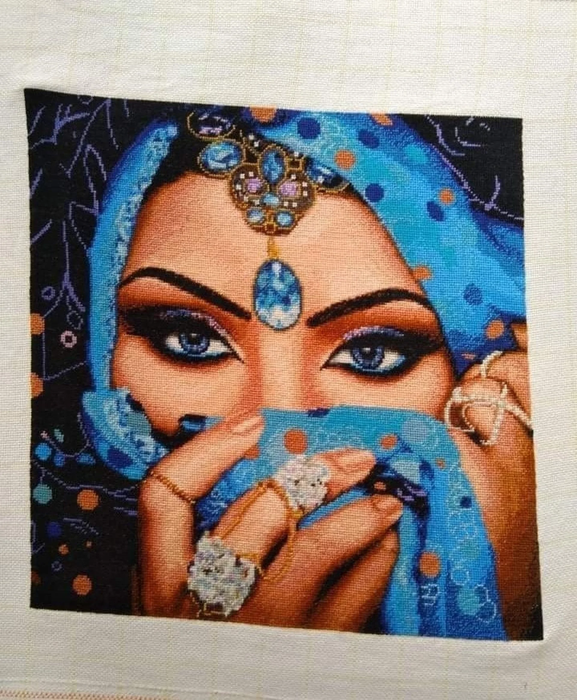 Комплектът на фирма Fantastic-R съдържа панама с игла, черно-бяла схема размер А4 и комплект конци готови за бродиране.