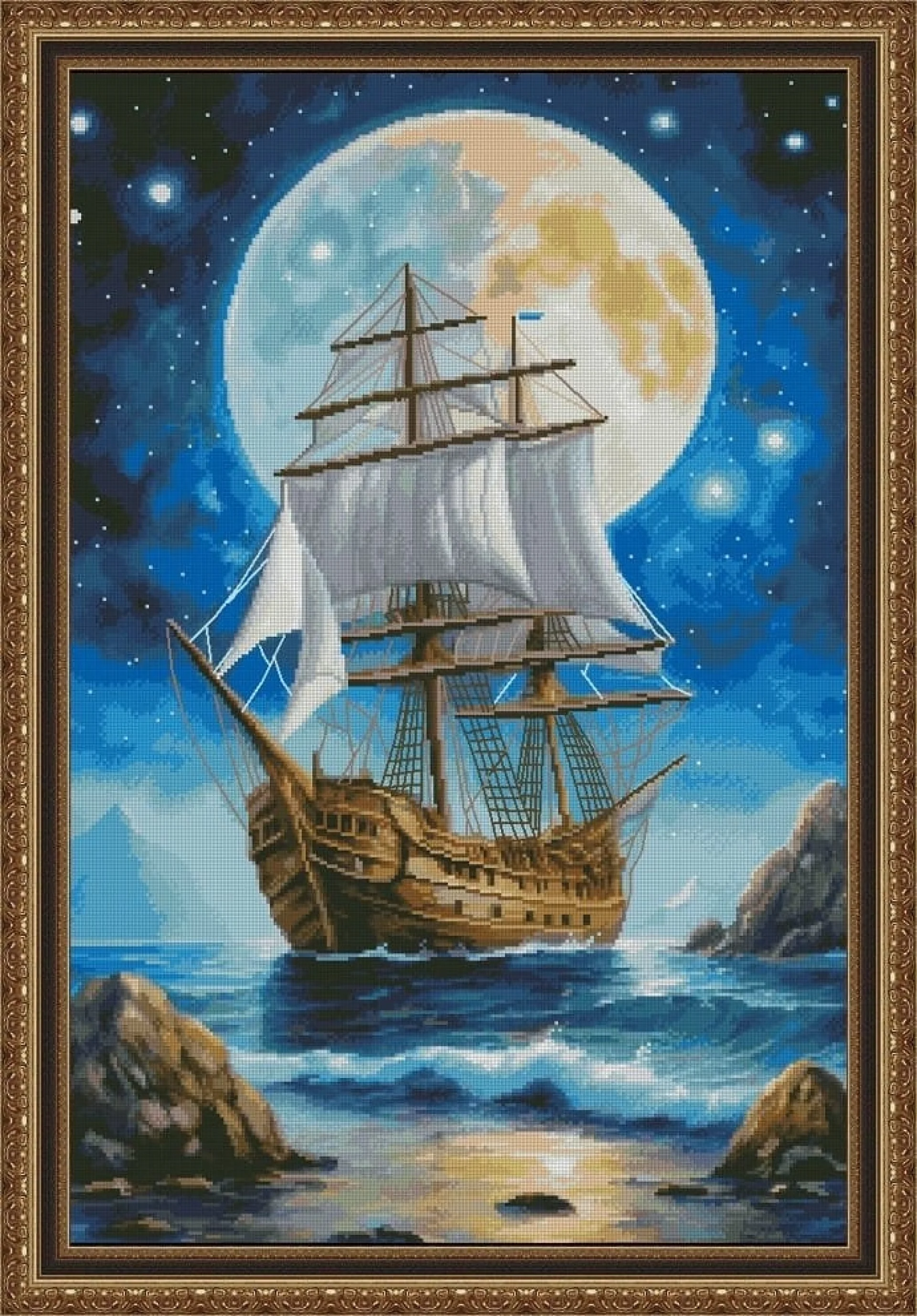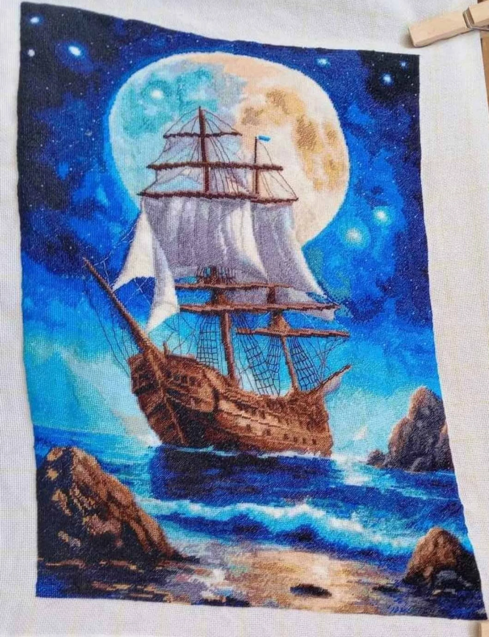 Комплектът на фирма Fantastic-R съдържа панама с игла, черно-бяла схема размер А4 и комплект конци готови за бродиране.