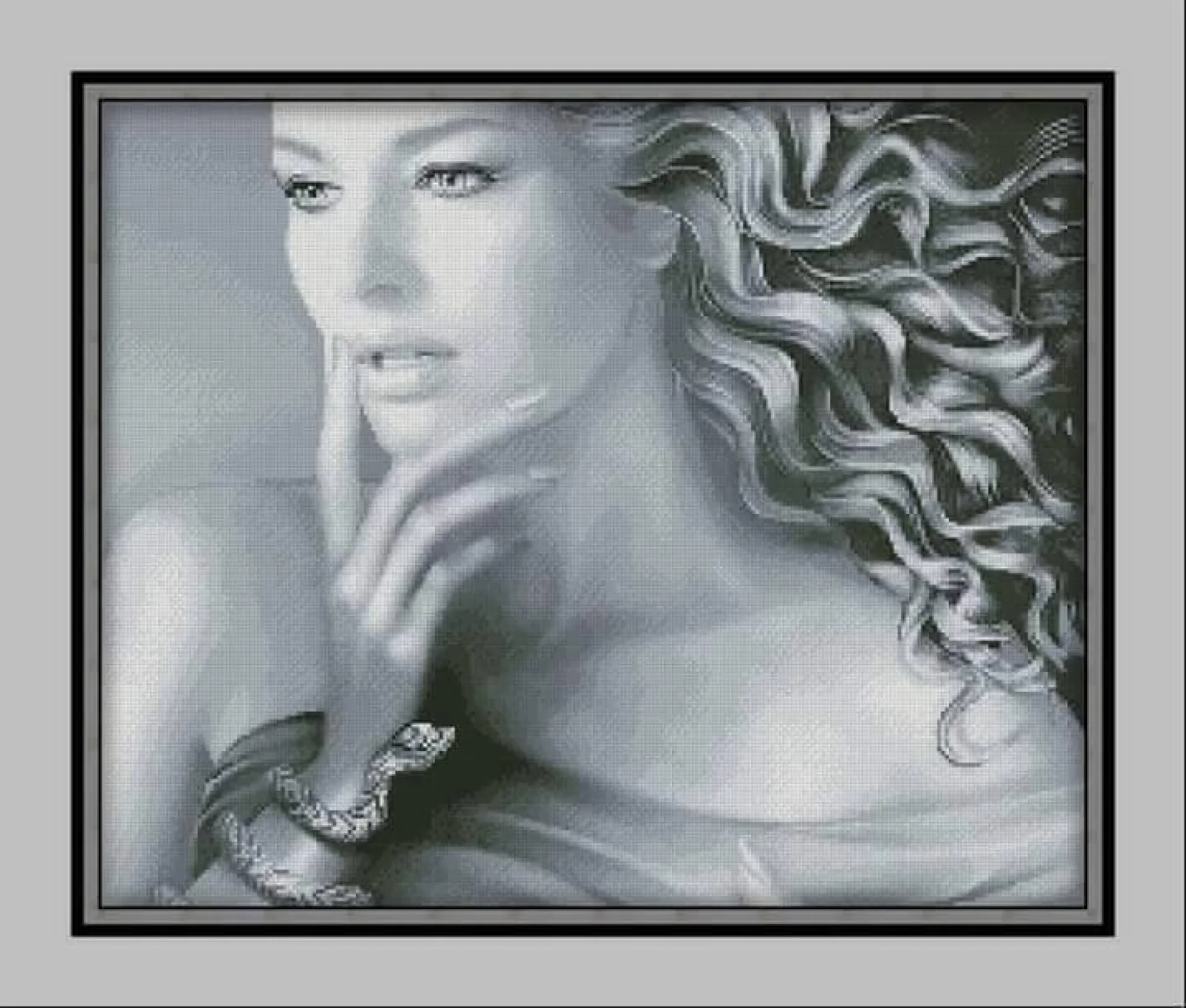Комплектът на фирма Fantastic-R съдържа панама с игла, черно-бяла схема размер А4 и комплект конци готови за бродиране.
