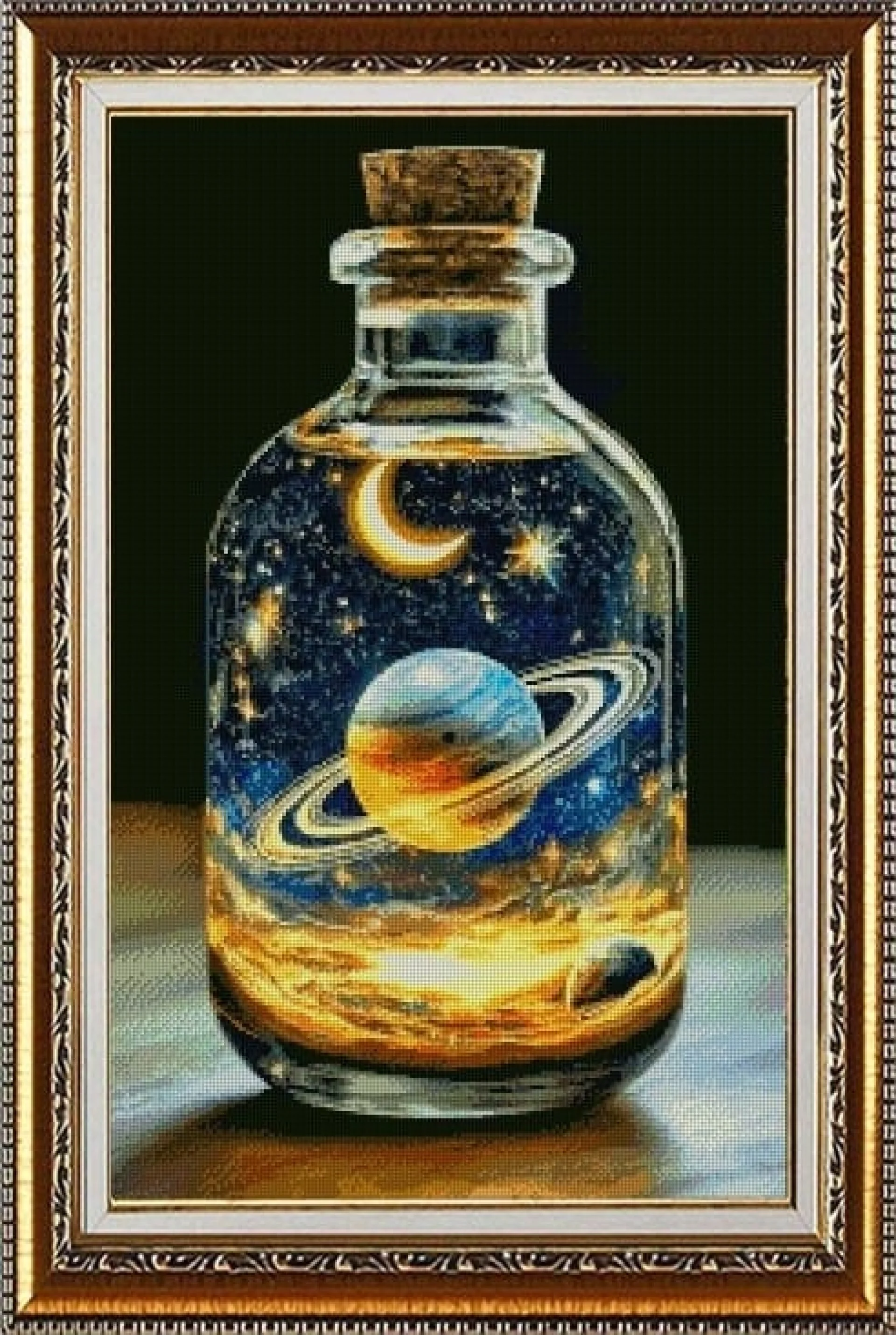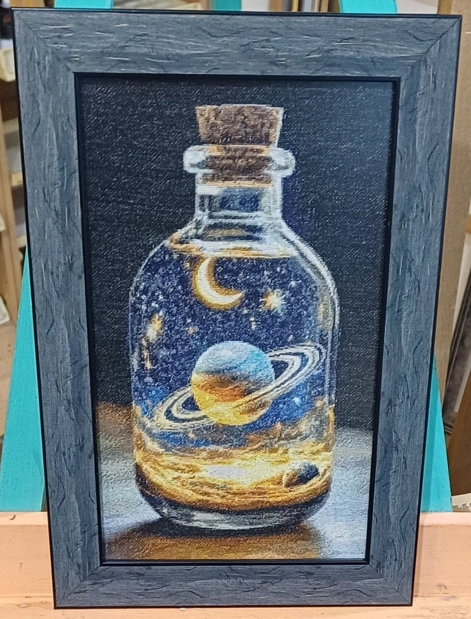 Комплектът на фирма Fantastic-R съдържа панама с игла, черно-бяла схема размер А4 и комплект конци готови за бродиране.