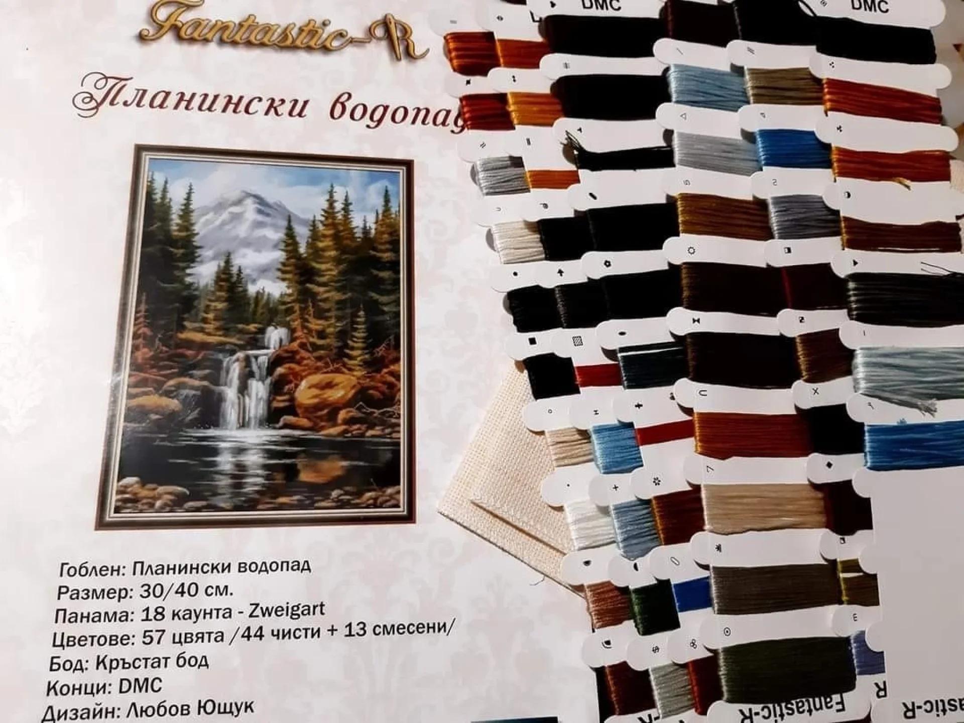 Комплектът на фирма Fantastic-R съдържа панама с игла, черно-бяла схема размер А4 и комплект конци готови за бродиране.