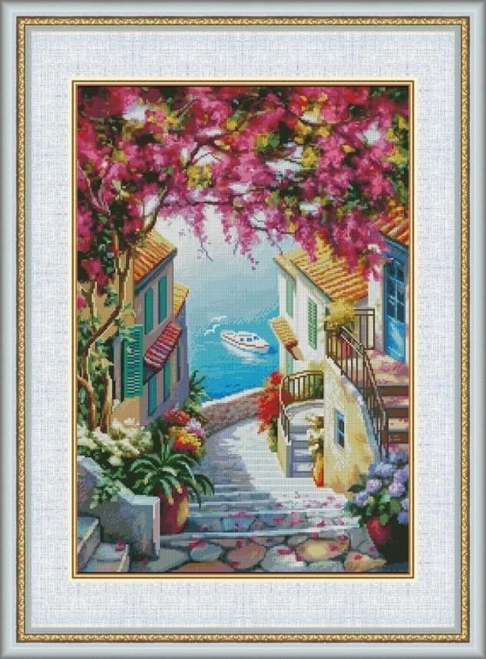 Комплектът на фирма Fantastic-R съдържа панама с игла, черно-бяла схема размер А4 и комплект конци готови за бродиране.