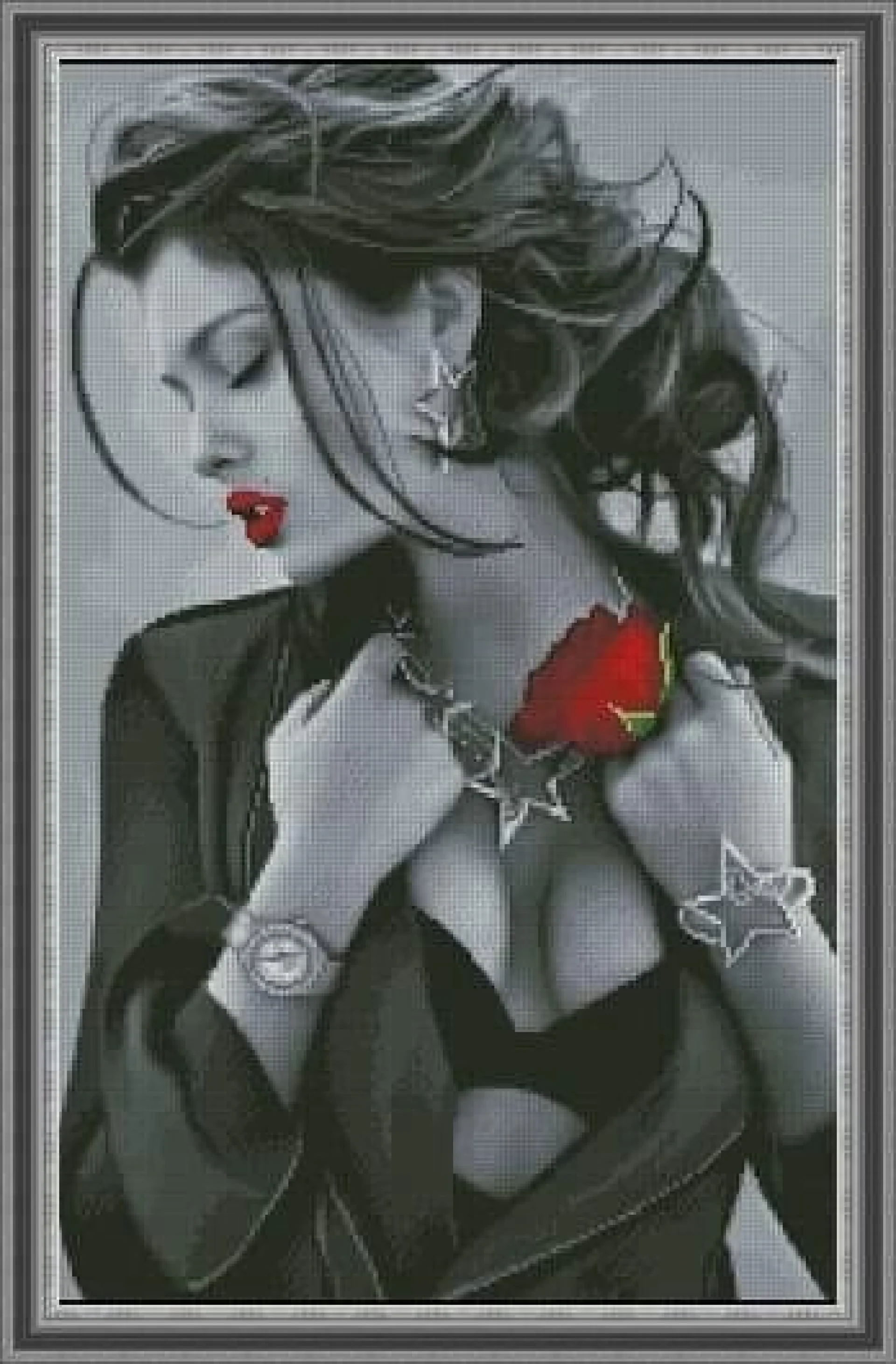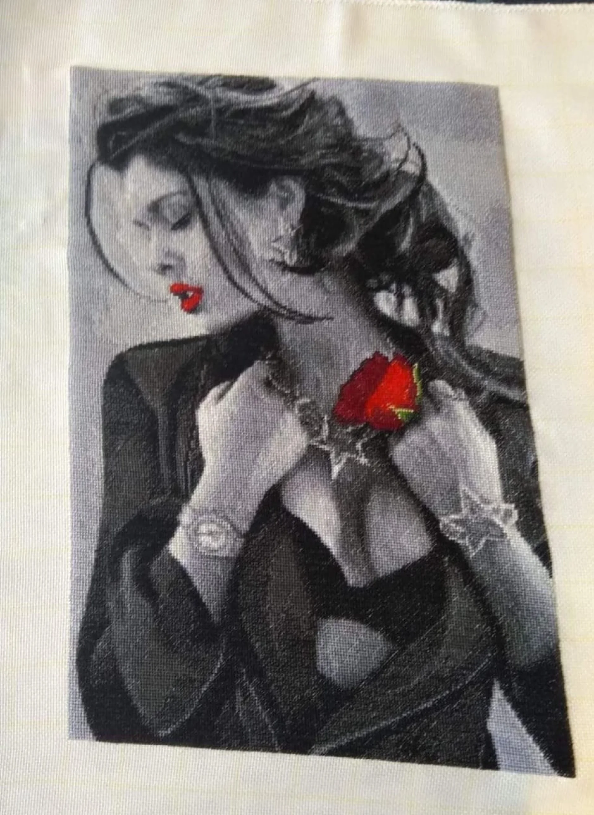 Комплектът на фирма Fantastic-R съдържа панама с игла, черно-бяла схема размер А4 и комплект конци готови за бродиране.