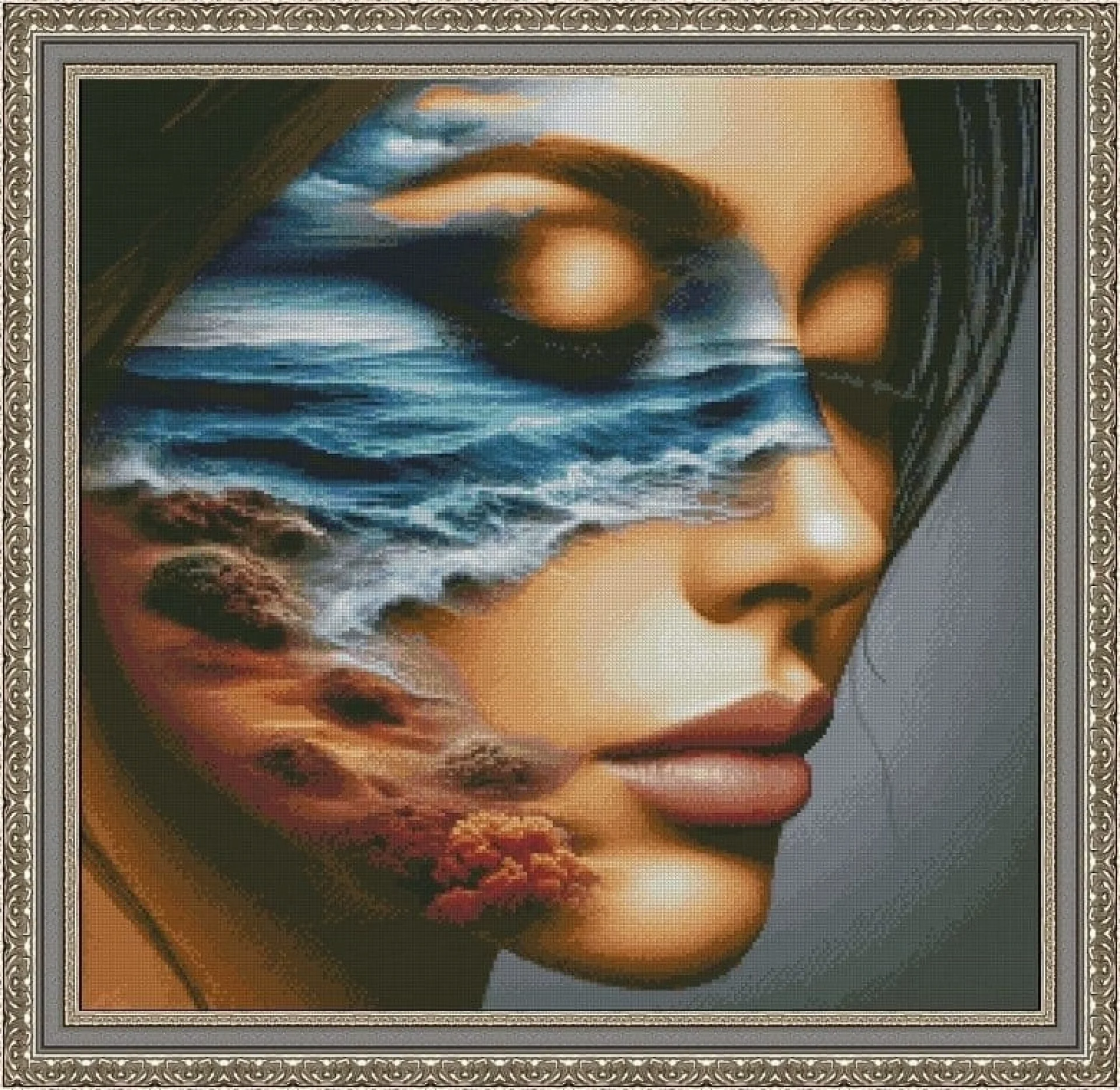 Комплектът на фирма Fantastic-R съдържа панама с игла, черно-бяла схема размер А4 и комплект конци готови за бродиране.